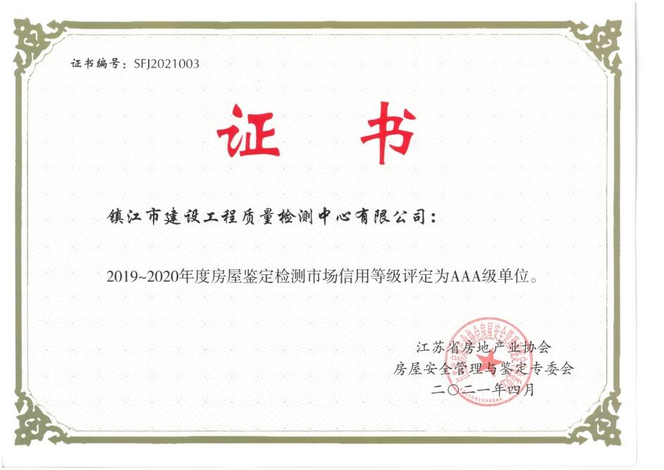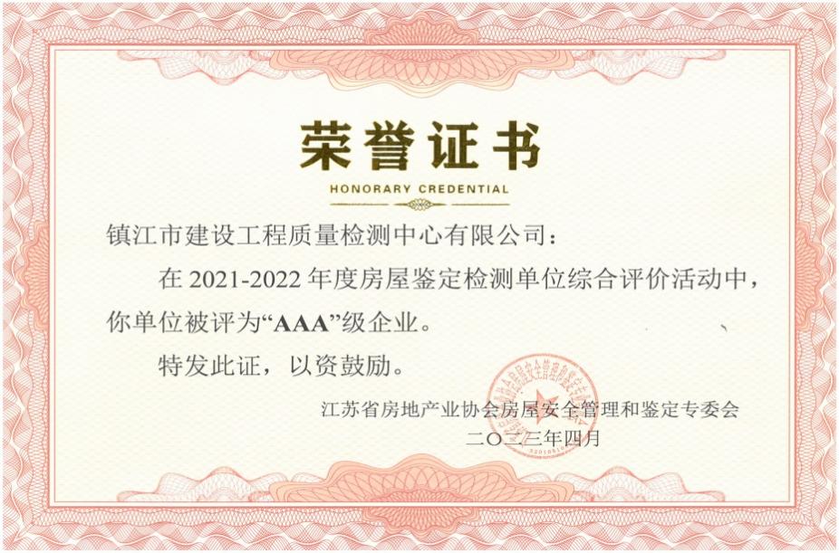 2023年4月,江苏省房地产业协会房屋安全管理和鉴定专委会会员大会在镇江召开,会上宣读了《关于公布2021~2022年度鉴定检测企业综合评价等级的通知》,检测中心荣获“AAA”级企业。