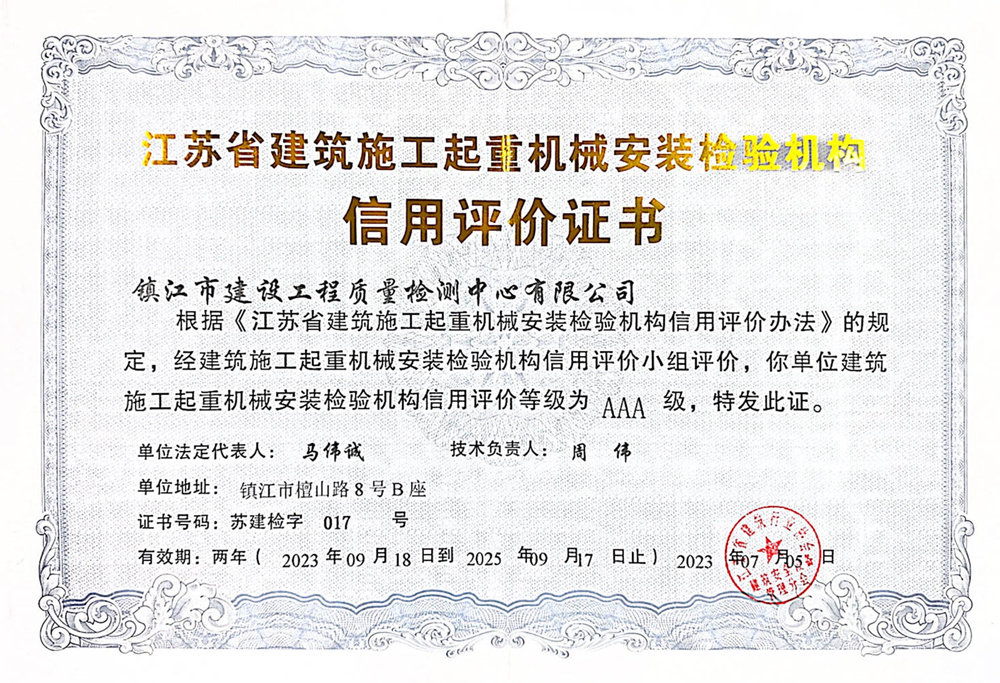检测中心顺利通过江苏省建筑施工起重机械检验机构3A级信用评价