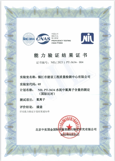 PT-3634水泥中氯离子含量的测定(国际比对)”能力验证,运用电位滴定的方法对水泥样品中的氯离子含量进行检测,提交的检测结果评价为“满意”,顺利通过此次能力验证。
