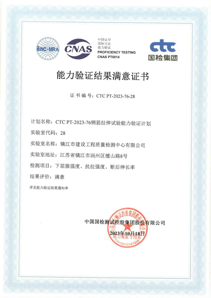 2023年检测中心参加了中国国检测试控股集团股份有限公司组织的“CTC PT-2023-76-28钢筋拉伸试验能力验证计划”。近日,我中心收到评价结果,其结果为“满意”。